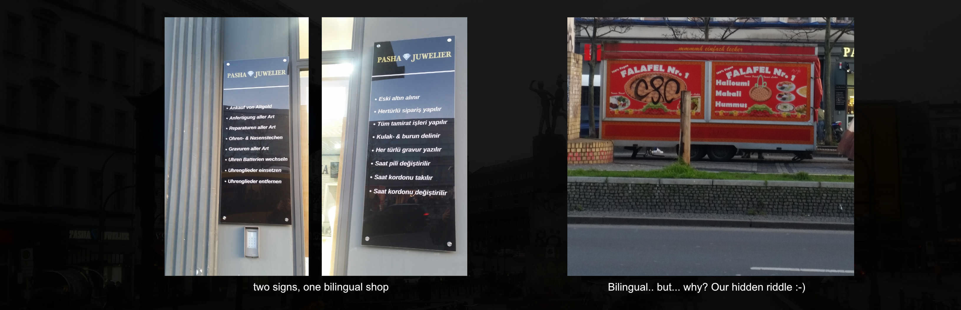 All in all this shows, that shop front signs at Hermannplatz are mainly bilingual and written in German and English.