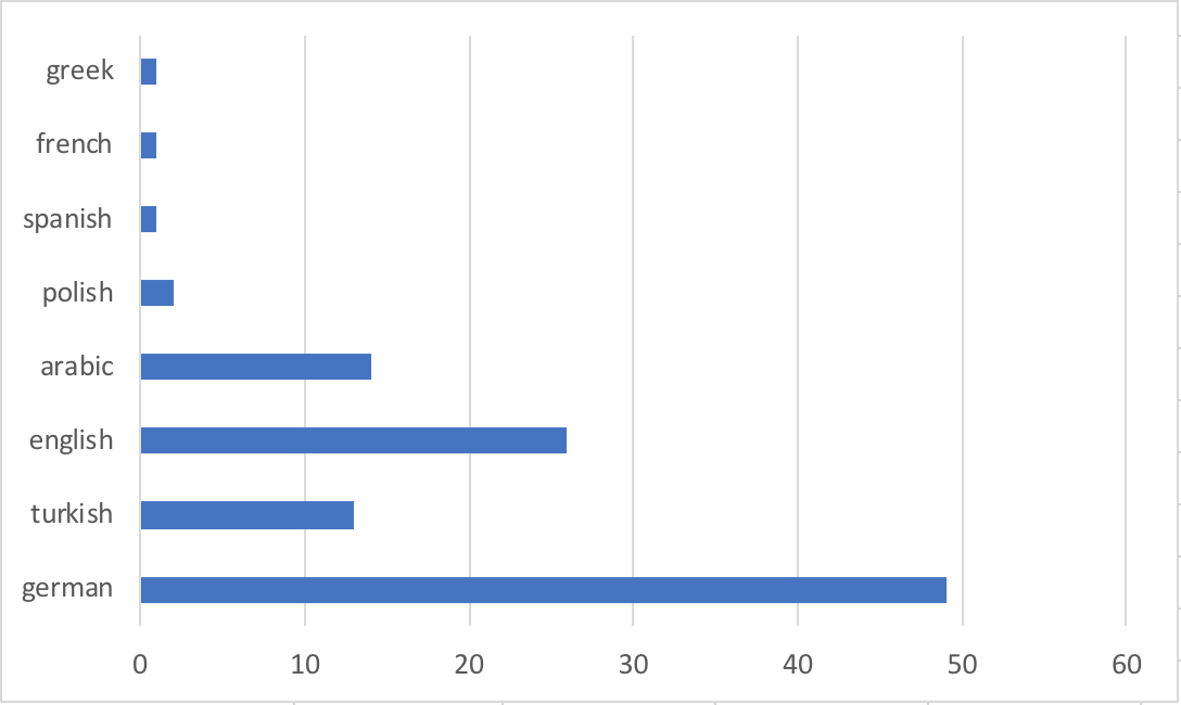 The two charts seen above show the different languages found in our study and the frequency in which they appear as well as the frequency of monolingual, bilingual and multilingual signs. The most frequent language found is German, followed by English and Arabic as well as Turkish. Appearances of signs in Polish, Spanish, French and Greek were rather low. Furthermore, the German language was found twice as often on signs as English and almost three times more often than Arabic and Turkish.