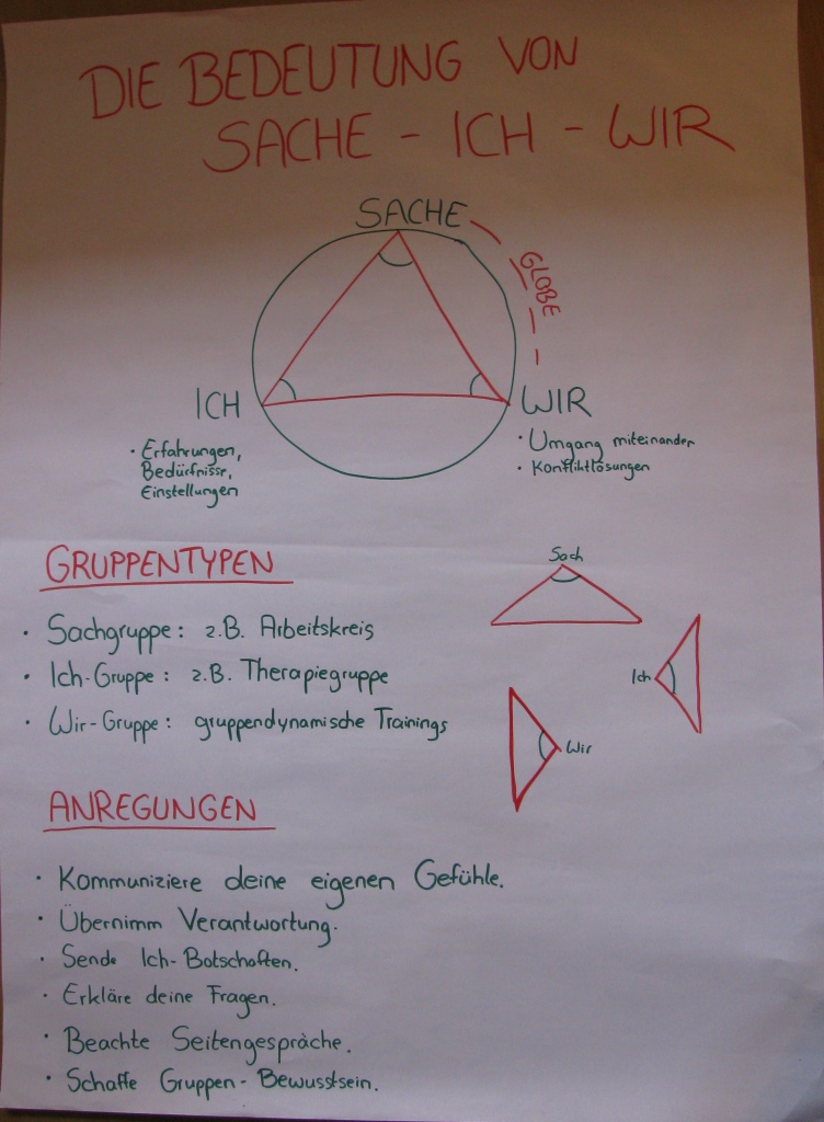 Die TZI ist ein einfaches Modell für effektive Gruppenarbeit, das davon ausgeht, dass es eine Balance zwischen den Bedürfnissen der einzelnen (dem „Ich“), den Interaktionen und Gruppenbedürfnissen (dem „wir“) und der Aufgabe der Gruppe (dem „es“) geben muss. Außerdem gibt es in der TZI einige wichtige Regeln („Postulate“), z.B., dass Störungen thematisiert werden müssen, dass jede und jeder für die eigenen Bedürfnisse sorgen muss und dass Kommunikationsregeln vereinbart werden müssen.