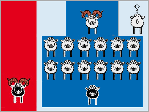 Der Widder entspricht dem Alpha, das Schaf mit dem Fragezeichen dem Beta, die 12 Schafe den Gammas, das schwarze Schaf unten dem Omega, und der schwarze Widder im roten Feld dem G = Gegner außerhalb der Gruppe. Raoul Schindler hat festgestellt, dass sich in jeder Gemeinschaft diese Struktur herausbildet.
